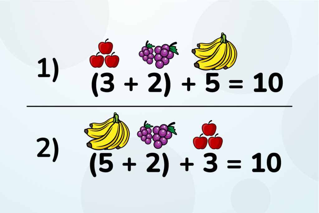 - Sumando las manzanas y las uvas primero, para luego sumarles los cambures (3+2)+5=10